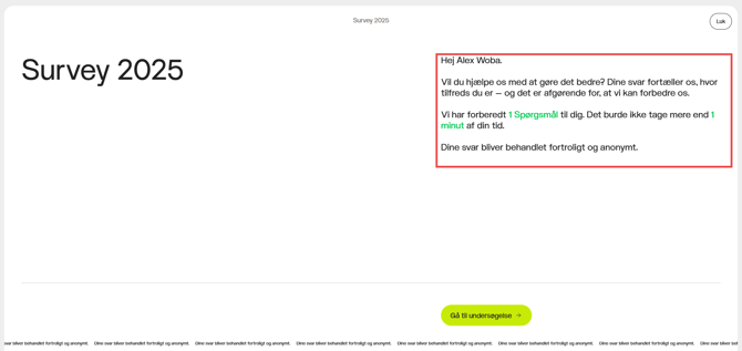 Teksten "Dine svar til denne undersøgelse er ikke anonyme" bruges til undersøgelser, der ikke er anonyme. Hvis undersøgelsen er anonym, vil der stå: "Dine svar bliver behandlet fortroligt og anonymt."