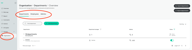 Klik på Afdelinger, Medarbejdere eller Admins alt efter de oplysninger, du ønsker at opdatere.