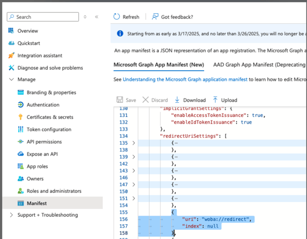However, the Woba mobile app uses a custom URI (woba://), which is not a standard web address.Therefore, it can only be registered through the manifest, where Azure allows advanced and non-standard URI formats.
