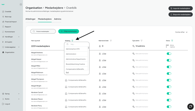 Tip: Du kan filtrere medarbejdere på baggrund af afdeling ved at bruge filteret "Afdeling".